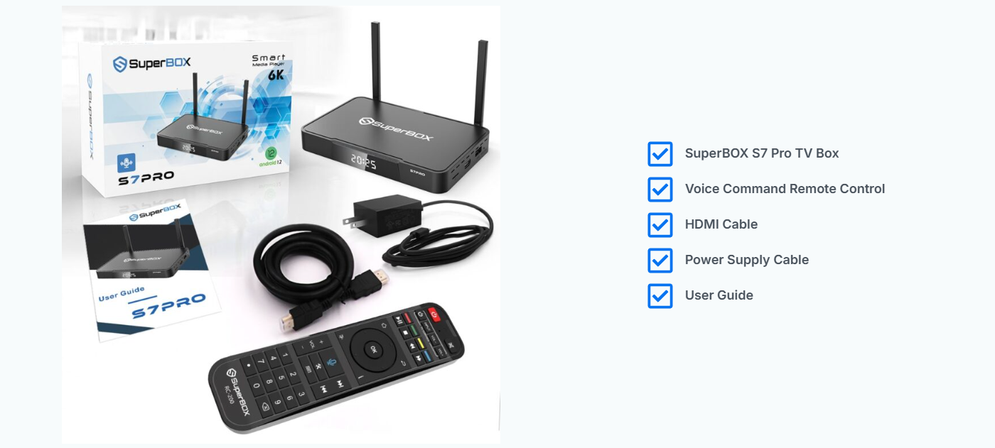- Advanced Voice Command: With the SuperBox S7 Pro, controlling your TV with your voice is easy to do. You can search and open shows, control playback, or open apps in just a couple of seconds thanks to the improved voice command system's faster replies and improved accuracy. Simply speak, and it will happen instantly. Forget about typing or browsing lengthy menus. It's a minor enhancement that greatly simplifies your viewing habits.